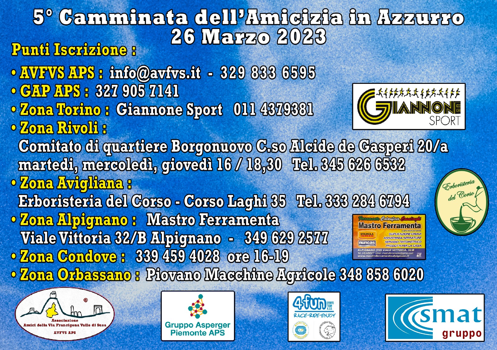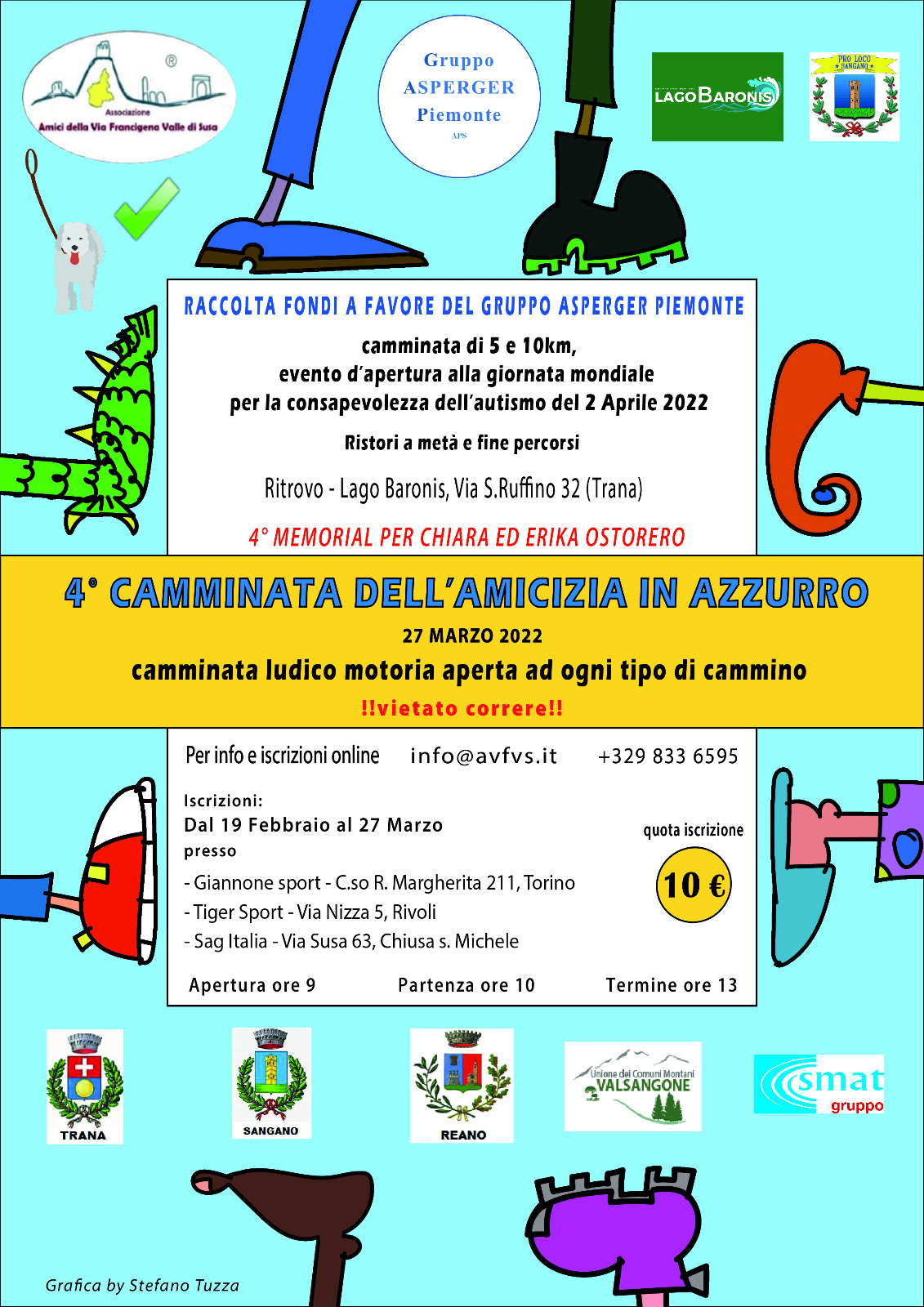 Edizione IVAnnunciamo l'apertura delle iscrizioni per la IV edizione della Camminata in Azzurro che si terrà il 27/03/2022 nella suggestiva natura che circonda il lago Baronis di Trana. L'iscrizione è di 10 Euro a persona, ed è aperta a chiunque. Per info e iscrizioni online potete scrivere a info@avfvs.it o telefonare al 329 8336595.